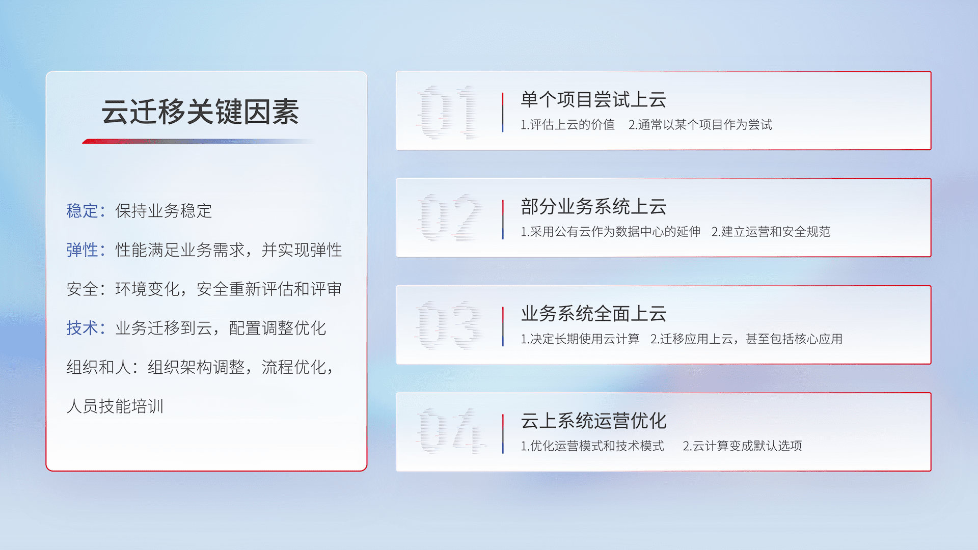 结合实际业务,,,从规划设计、、、云平台选型、、、、云原生改造、、、数据迁移、、、集成交付,,,,迁移全过程为客户识别最佳上云路径,,做好风险识别管理,,,,设计网络架构、、身份权限、、安全审计合规、、操作审计、、、日志审计、、、、监控告警策略、、多站点容灾设计等,,,对云上基础设施进行整体规划,,,,提升IT治理水平,,以满足弹性、、、、高可用、、、高性能的需求。。。。