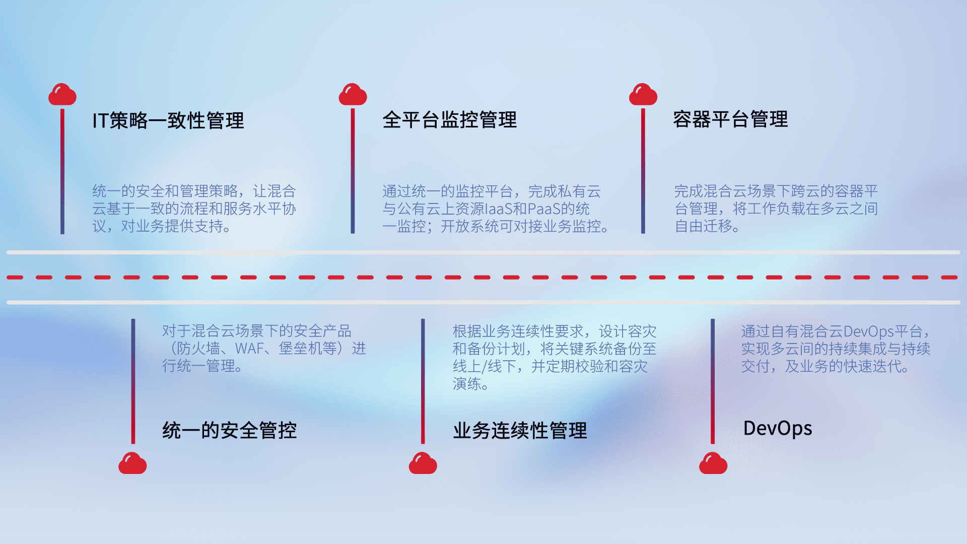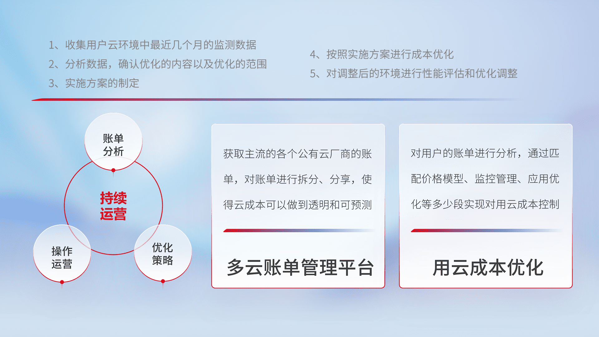 通过多云纳管,,,,以统一的资源数据模型把客户的云资源进行抽象和封装,,,,进而实现对多云资源的统一操作,,,保障云资源管理的可靠性、、、稳定性与可用性。。量身定制化运维内容,,,配置、、、、开发运维、、、、补丁管理、、、、备份、、、监控、、、认证和访问管理、、、审计和日常巡检等,,,,保障在用云过程中的可靠度,,,稳定度以及高可用率。。。