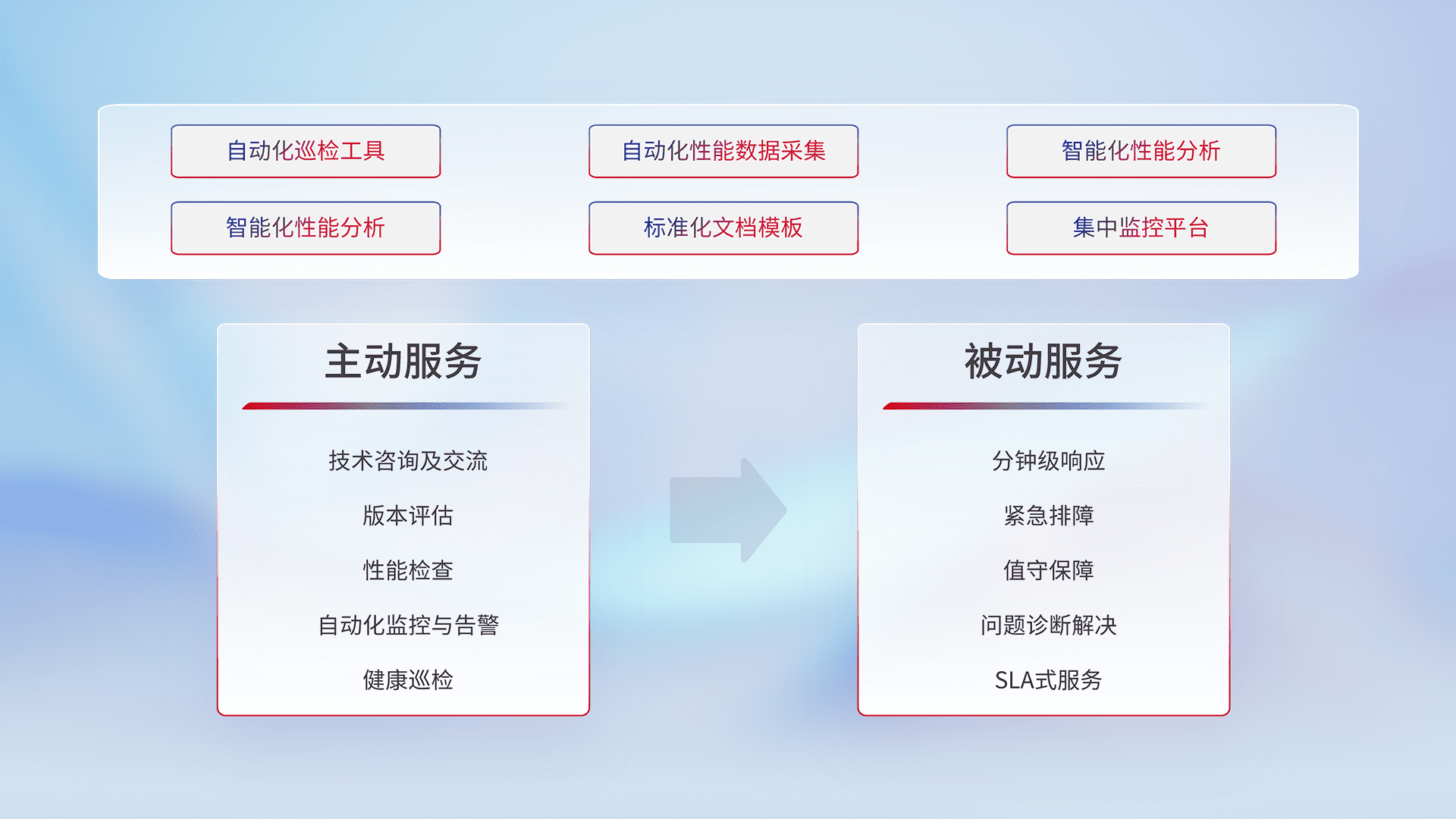 智能化工具和标准化文档,,,保障服务质量,,,,提供主动服务(包含技术咨询、、版本评估、、性能检查、、、自动化监控与告警、、健康巡检)和被动服务包含(分钟级响应、、、紧急排障、、值守保障、、、问题诊断解决、、、、SLA服务)。。。。